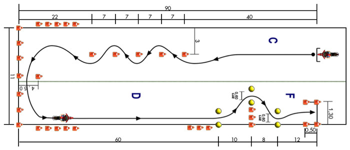 - Eslalon: Zigzaguea entre unos conos sin derribarlos. Es como jugar a no pisar las líneas del suelo, pero con tu moto.